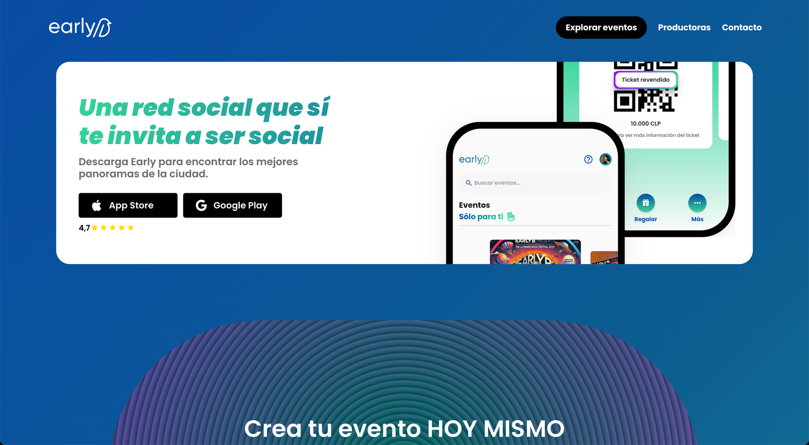 Early es una startup chilena que desarrolla una plataforma para la gestión de tickets y comunidades, pensada para organizadores de eventos y grupos que buscan conectar de manera más segura, simple y escalable con su público. Nació en 2024 como una idea entre amigos y hoy ya cuenta con ventas, financiamiento público (Semilla Expande de CORFO) y una proyección de crecimiento internacional.